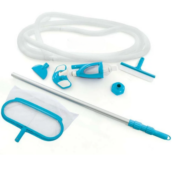 - Set ingrijire piscine DELUXE, art. 28003*(plasă, perie-aspirator,tijă telescopică, plasă pentru colectarea gunoiului de la suprafața apei; perie; duză de vid plată pentru conectarea la pompa de filtru; furtun de conectare 38mm x 7,5m;) (mai multe detalii despre set aici)